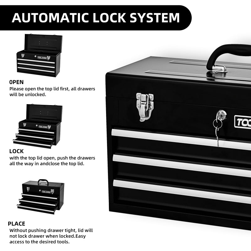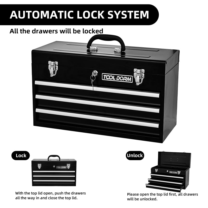 - Drawers can be locked automatically when top lid is closed. This function prevent drawers from slipping out when being carried and for more effective tool storage