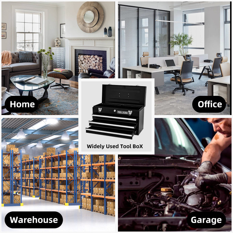 - Tool Box with 3 drawers and a top box to hold a variety of tools. Multiple storage spaces are convenient to classify the tools you have and organize it very well. Each drawer has EVA mats as protective liner