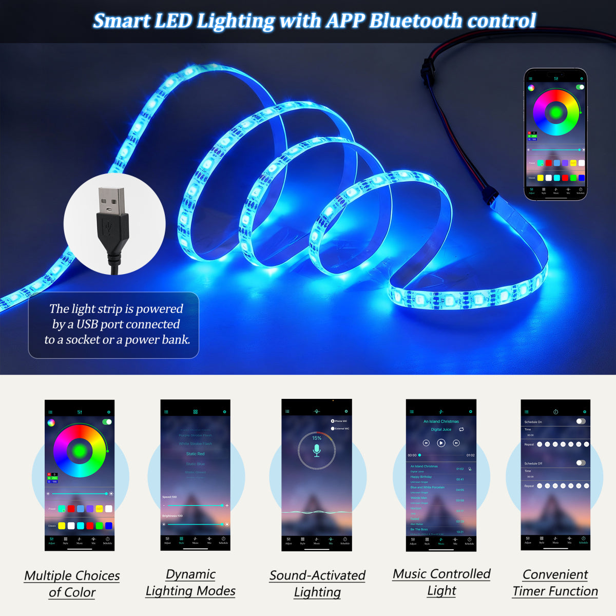 | USB Powered | Comes with a 5V 2A powered USB cable (USB plug not included) that can be plugged into your TV, computer and power bank, etc. Safe and easy to indoors use. |