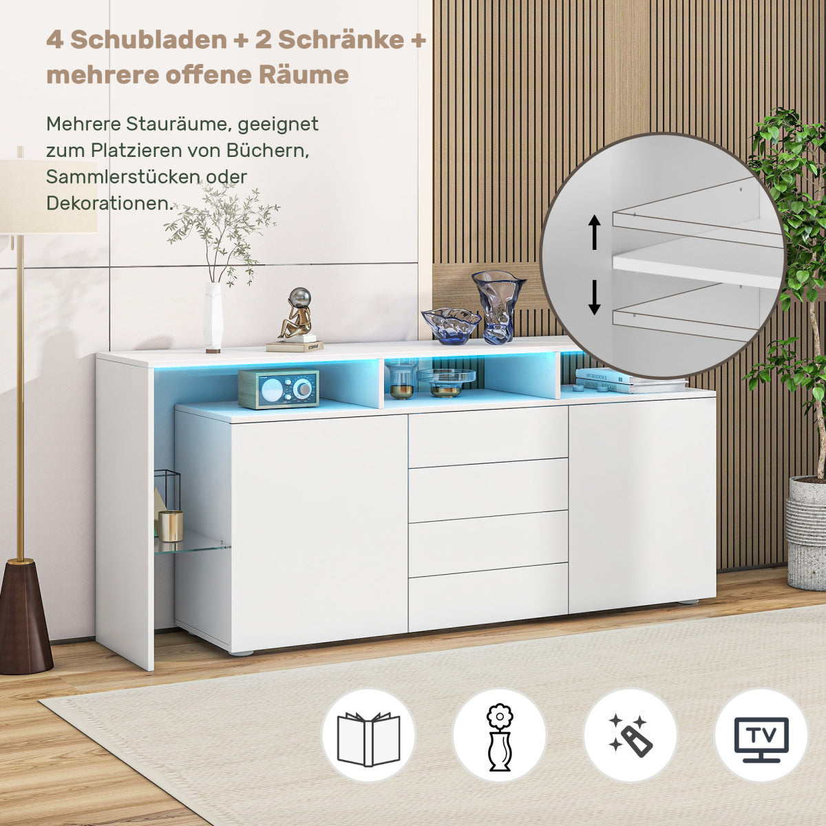 - 【Großer Stauraum und langlebiges Material】 Dieser 160 cm große Akzentschrank aus Holz besteht aus Spanplatten mit hervorragender Stabilität und einer leicht zu reinigenden Oberfläche. Verfügt über 2 Türen, 2 offene Stauräume, 4 Schubladen und 1 Glastrennwand zur Aufbewahrung verschiedener Gegenstände wie Notwendigkeiten, Teller und Tassen. Die Oberseite kann auch zum Präsentieren Ihrer Bücher, Vasen und Fotorahmen zur Dekoration Ihres Wohnzimmers verwendet werden. Küche / Schlafzimmer / Eingang