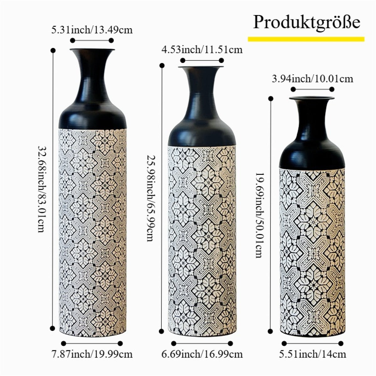 Dieses imposante 3er-Set Bodenvase ist ein handgefertigtes Kunstwerk aus hochwertigem Metall, das jedem Raum Eleganz, Noblesse und Stil verleiht. Die Vasen im Retro-Design mit der auffälligen Schwarz-Weiß-Farbkombination sind ein ideales Statement-Piece für Ihr Wohnzimmer, Schlafzimmer oder den Flur.