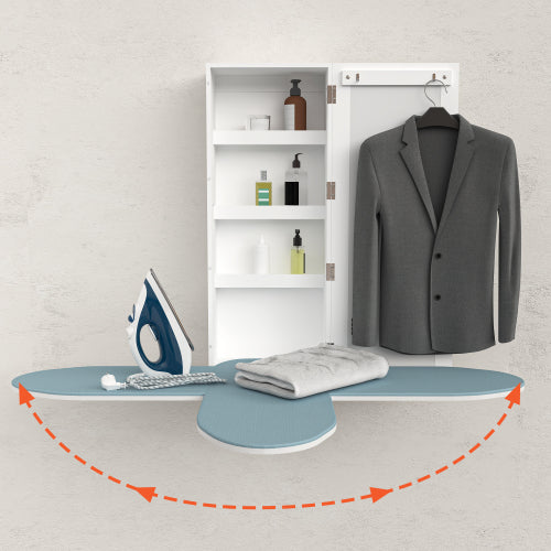 Stauraum & Spiegel: Im Schrankinneren befinden sich 3 Fächer, die Platz für Bügeleisen, Sprühflaschen und Zubehör bieten. An der Innenseite der Schranktür sind Haken zum Aufhängen von Kleidung angebracht. Bei geschlossener Tür dient die Außenseite als praktischer Spiegel.