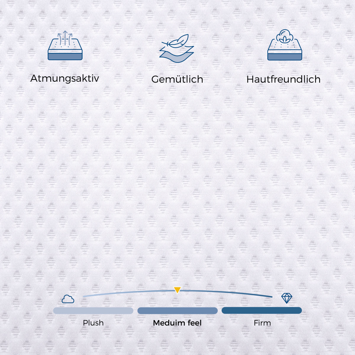 Der Bezug ist aus weichem Strickstoff gefertigt, der sich angenehm auf der Haut anfühlt und spezielle Funktionen bietet: Er ist milbenabweisend und schweißabsorbierend. Die Wärmeableitung auf beiden Seiten des Bezugs sorgt für ein trockeneres und hygienischeres Schlafklima.