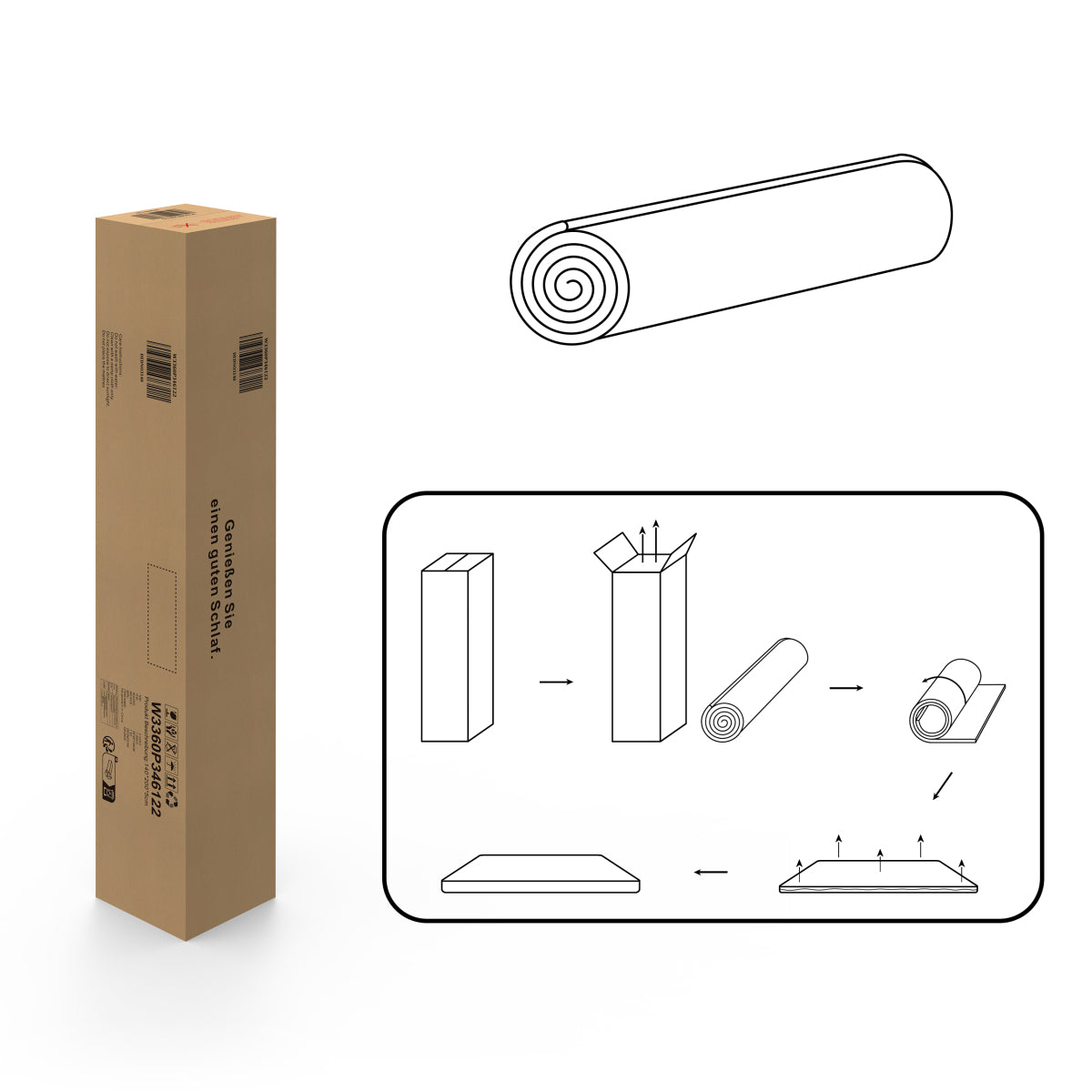 Die Matratze wird effizient komprimiert im Karton geliefert, was den Transport erleichtert. Nach dem Auspacken entfaltet sie sich vollständig innerhalb von ca. 24 Stunden.