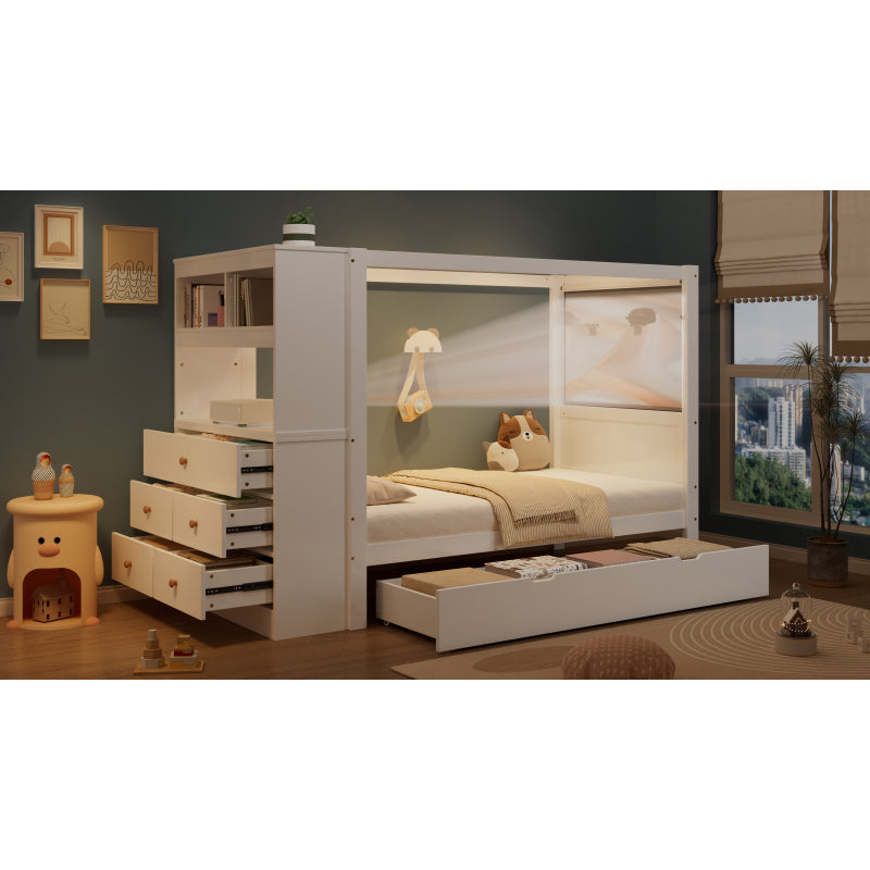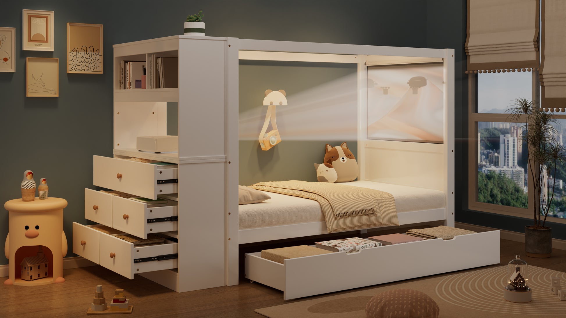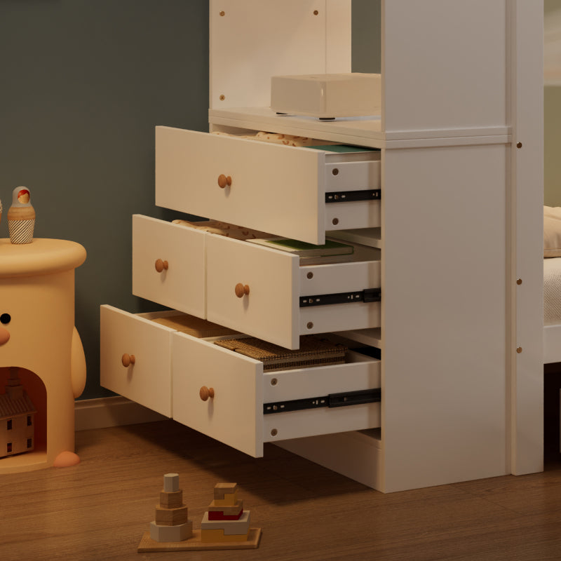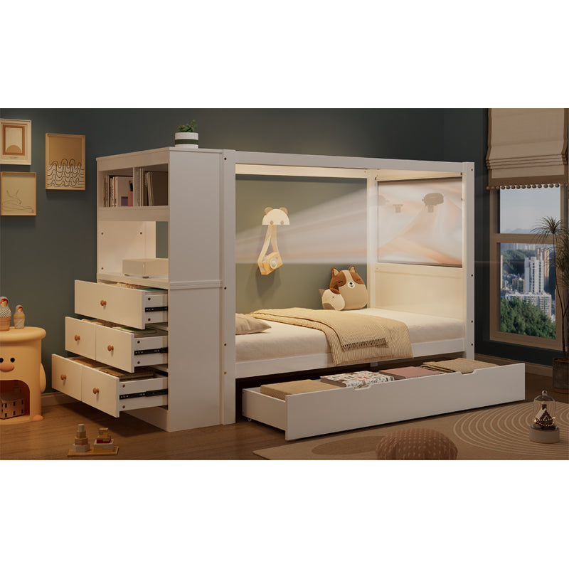 1.Viel Stauraum 2.Unterbettschublade mit Laufschienen 3.Hochwertige Materialien, stabile Konstruktion 4.Design mit mehreren Schubladen 5.Geeignet für verschiedene Kinderzimmerdekorationen