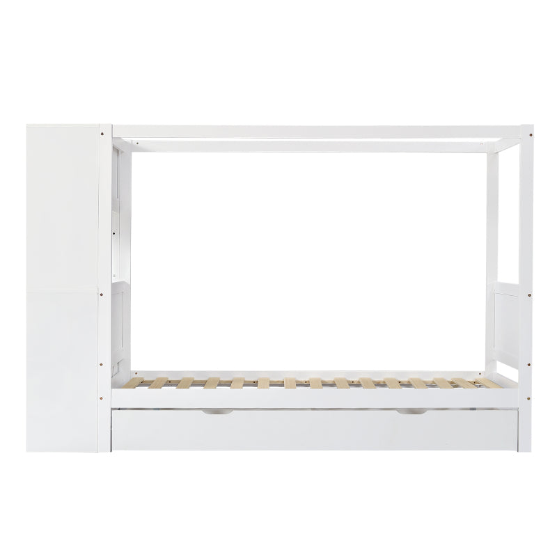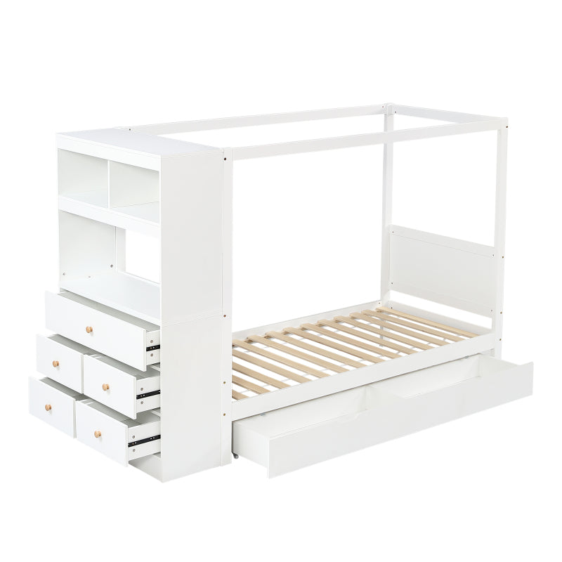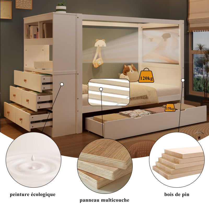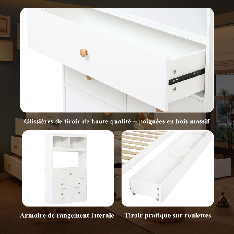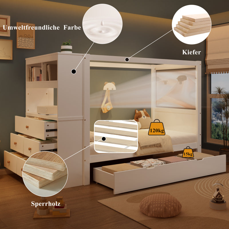 Matratzengröße für dieses Einzelbett: 90x200cm, empfohlene Matratzenstärke 12cm. Dieses Einzelbett hat ein einzigartiges Design, das sowohl funktional als auch schön ist. Die Hauptfarbe des Bettes ist weiß. An der Seite befindet sich ein Lagerschrank. Das Design mit mehreren Schubladen ermöglicht das bequeme Sortieren und Aufbewahren von Kleidung, Büchern und anderen Dingen des täglichen Bedarfs. Wählen Sie dieses Einzelbett und schaffen Sie für Ihr Kind ein Zimmer voller Überraschungen und Gelächter!!