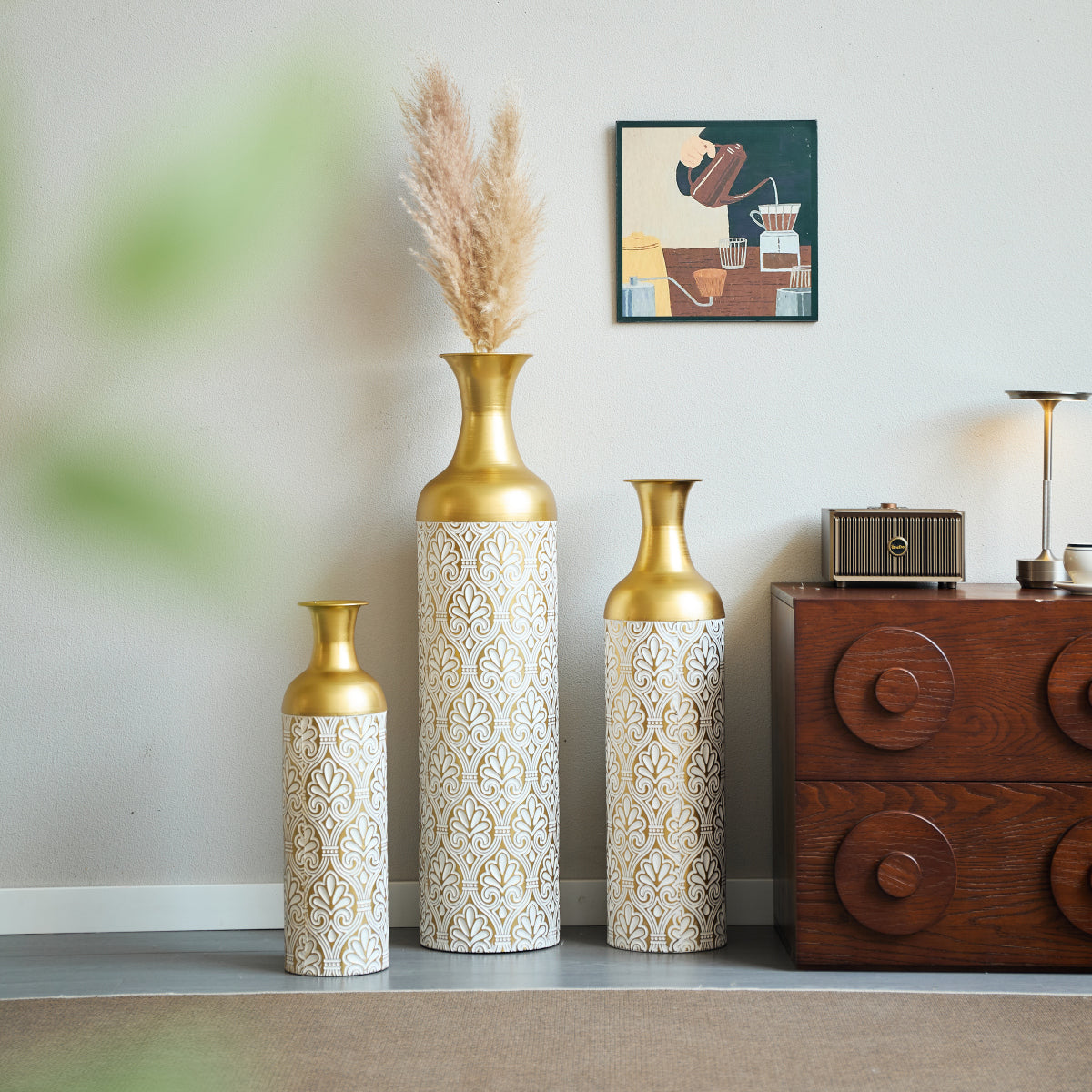 Dieses imposante 3er-Set Bodenvase ist ein handgefertigtes Kunstwerk aus hochwertigem Metall, das jedem Raum Eleganz, Noblesse und Stil verleiht. Die Vasen im Retro-Design mit der auffälligen Schwarz-Weiß-Farbkombination sind ein ideales Statement-Piece für Ihr Wohnzimmer, Schlafzimmer oder den Flur.