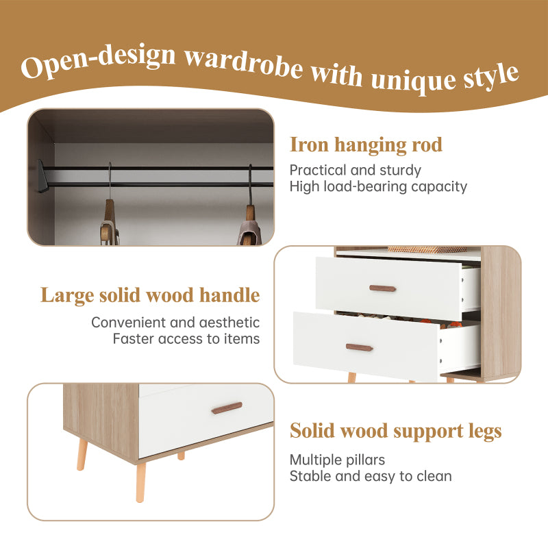 - 1. Schichtweises Aufbewahrungskonzept: Offene Oberregion mit einer Kleiderstange (zum bequemen Aufhängen von Kleidung) + 2 unteren Schubladen (für Socken, Accessoires u.ä.) – Effizientes Aufteilen von Gegenständen, alle schnell auffindbar.