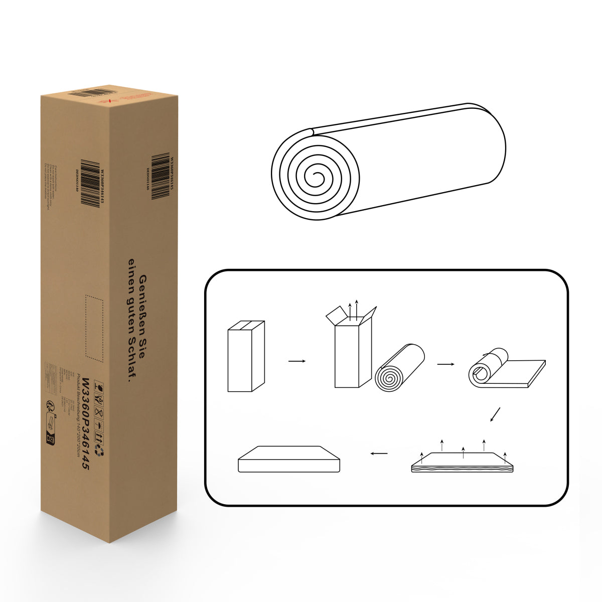 Die Matratze wird effizient komprimiert im Karton geliefert, was den Transport erleichtert. Nach dem Auspacken entfaltet sie sich schnell in ihre volle Form (ca. 24 Stunden).