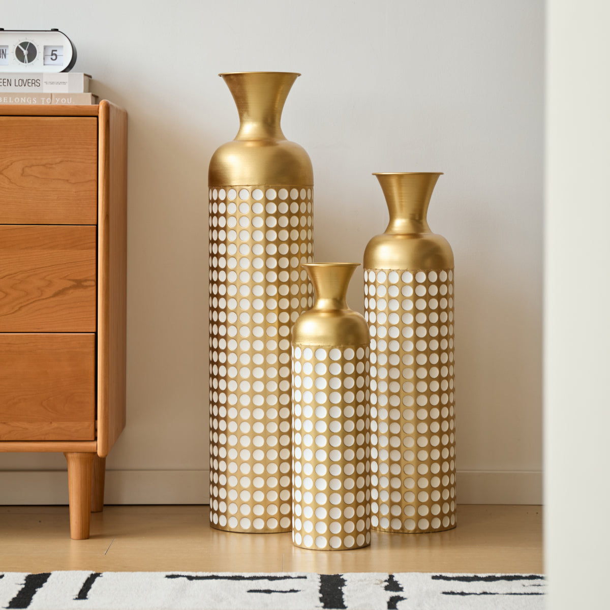 Dieses imposante 3er-Set Bodenvase ist ein handgefertigtes Kunstwerk aus hochwertigem Metall, das jedem Raum Eleganz, Noblesse und Stil verleiht. Die Vasen im Retro-Design mit der auffälligen Schwarz-Weiß-Farbkombination sind ein ideales Statement-Piece für Ihr Wohnzimmer, Schlafzimmer oder den Flur.