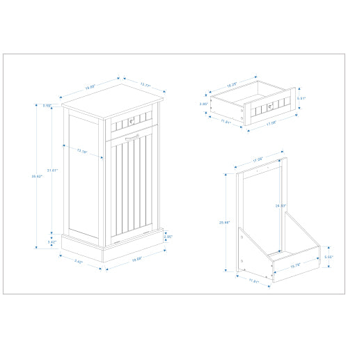 - Tilt-out trash cabinet (for 10 gallon trash cans), which can hide the trash cans well, keep the kitchen delicate and the floor clean. It also blocks odors from emanating, while your pets will never knock over the trash cans anymore.You can put coffee makers, photo frames, and succulent plants on the top,a pull-out drawer, you can store kitchen supplies, pet food, and the slanted drawer below can even be used as a laundry cabinet.