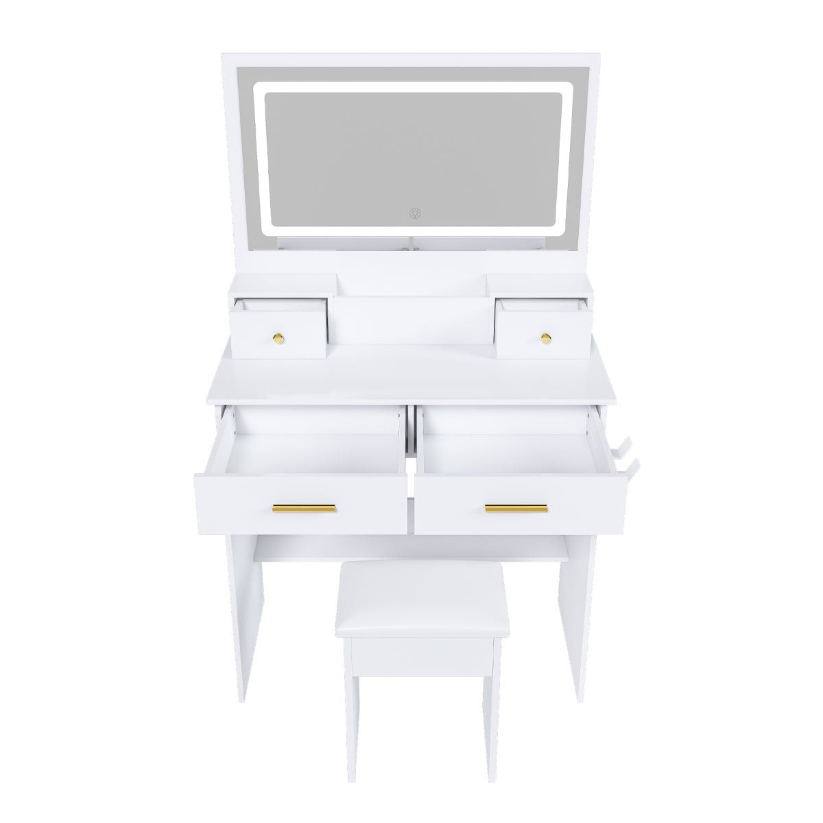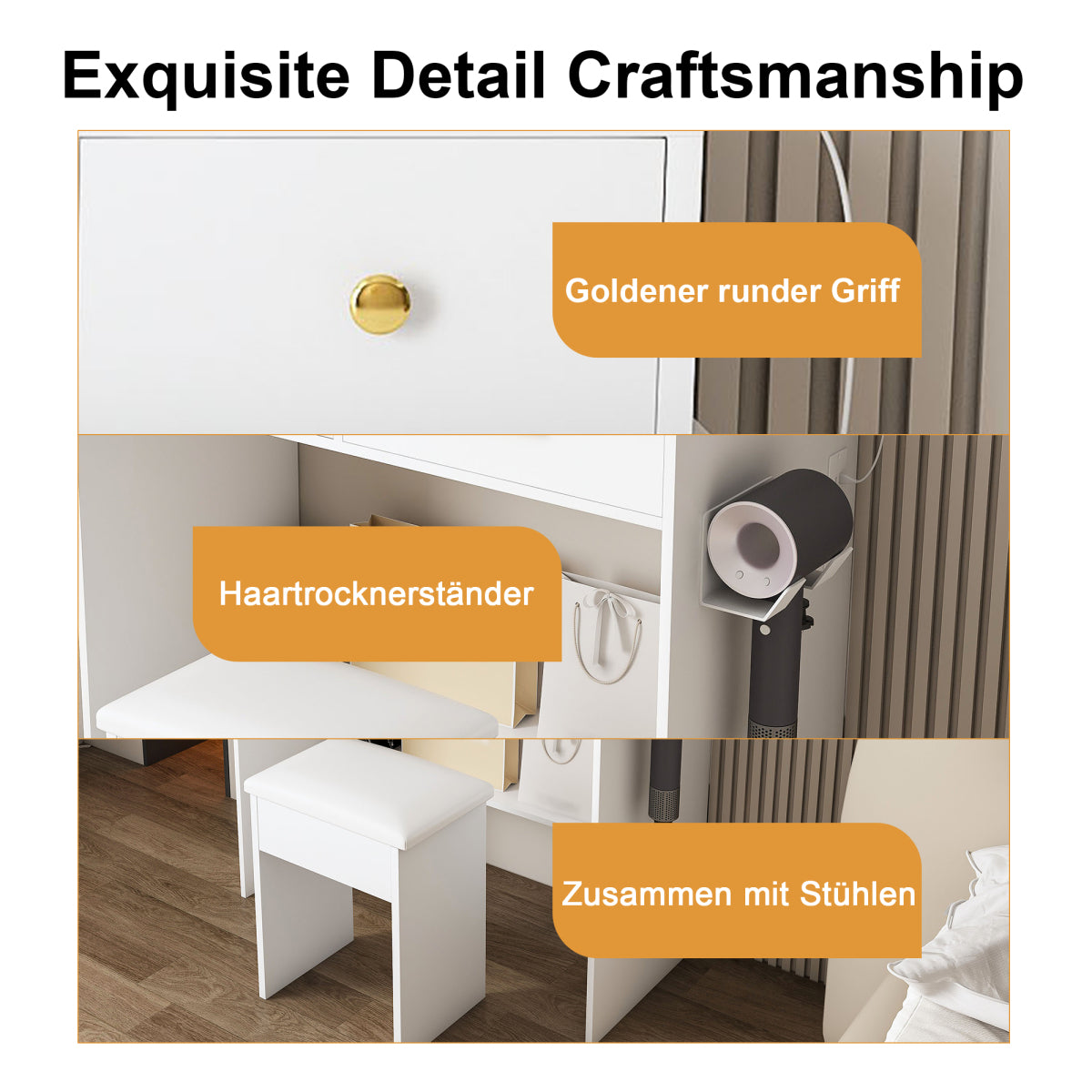 Vier geräumige, gleitende Schubladen ermöglichen eine klare Organisation. Lagern Sie Kosmetik, Pinsel, Schmuck und Pflegeprodukte übersichtlich, damit Ihr Schminkplatz stets aufgeräumt und alles griffbereit ist.
