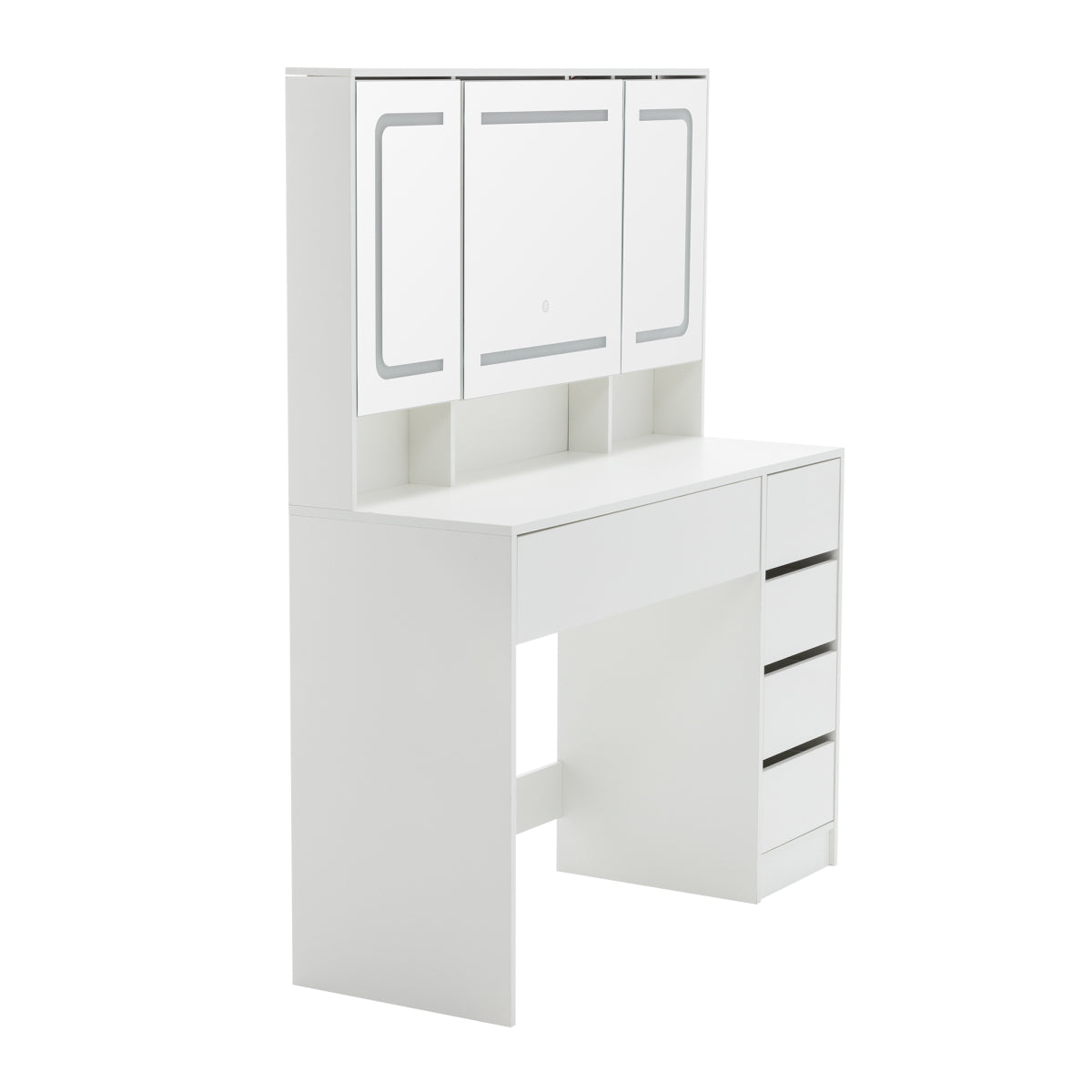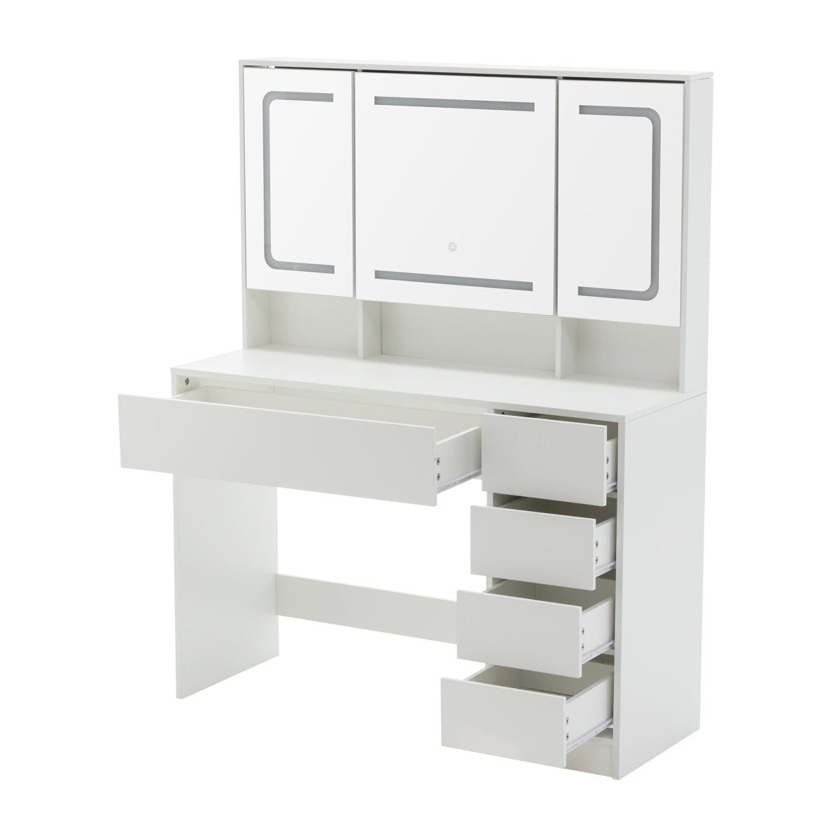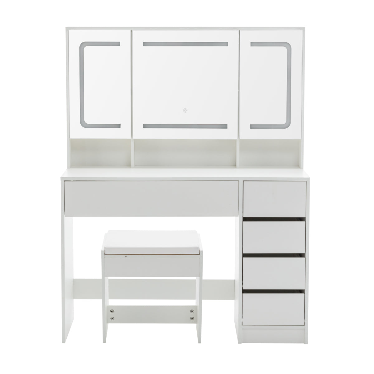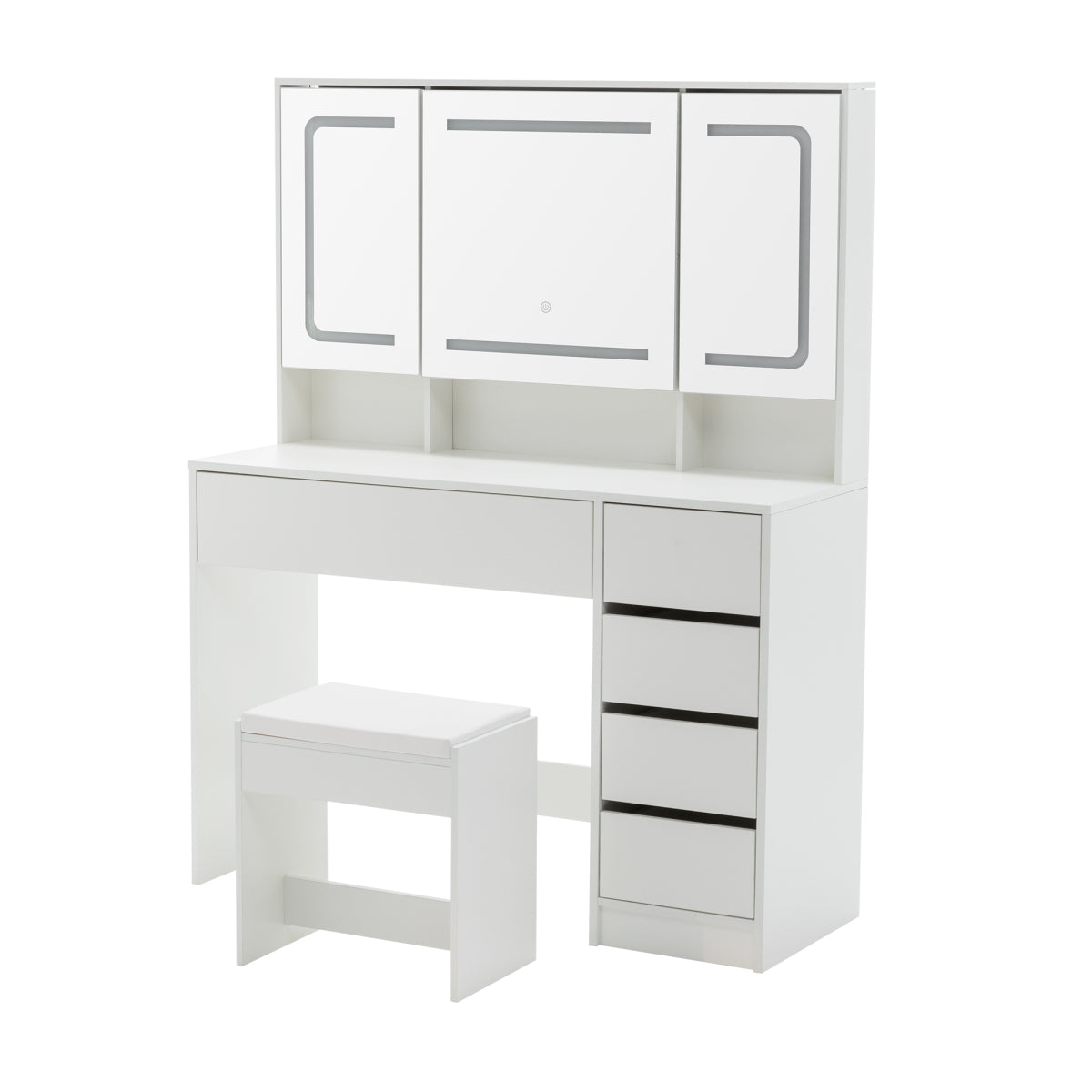 - Praktisches Komplettset – alles im Paket enthalten: Schminktisch, LED-Spiegel, Staufächer + passender Hocker.