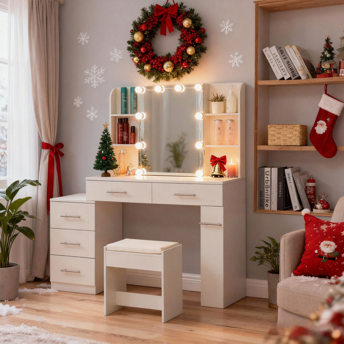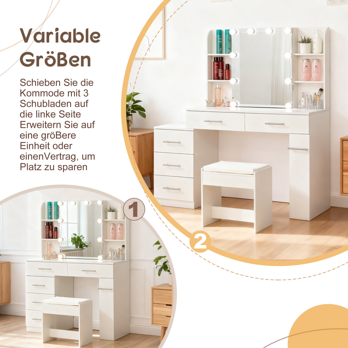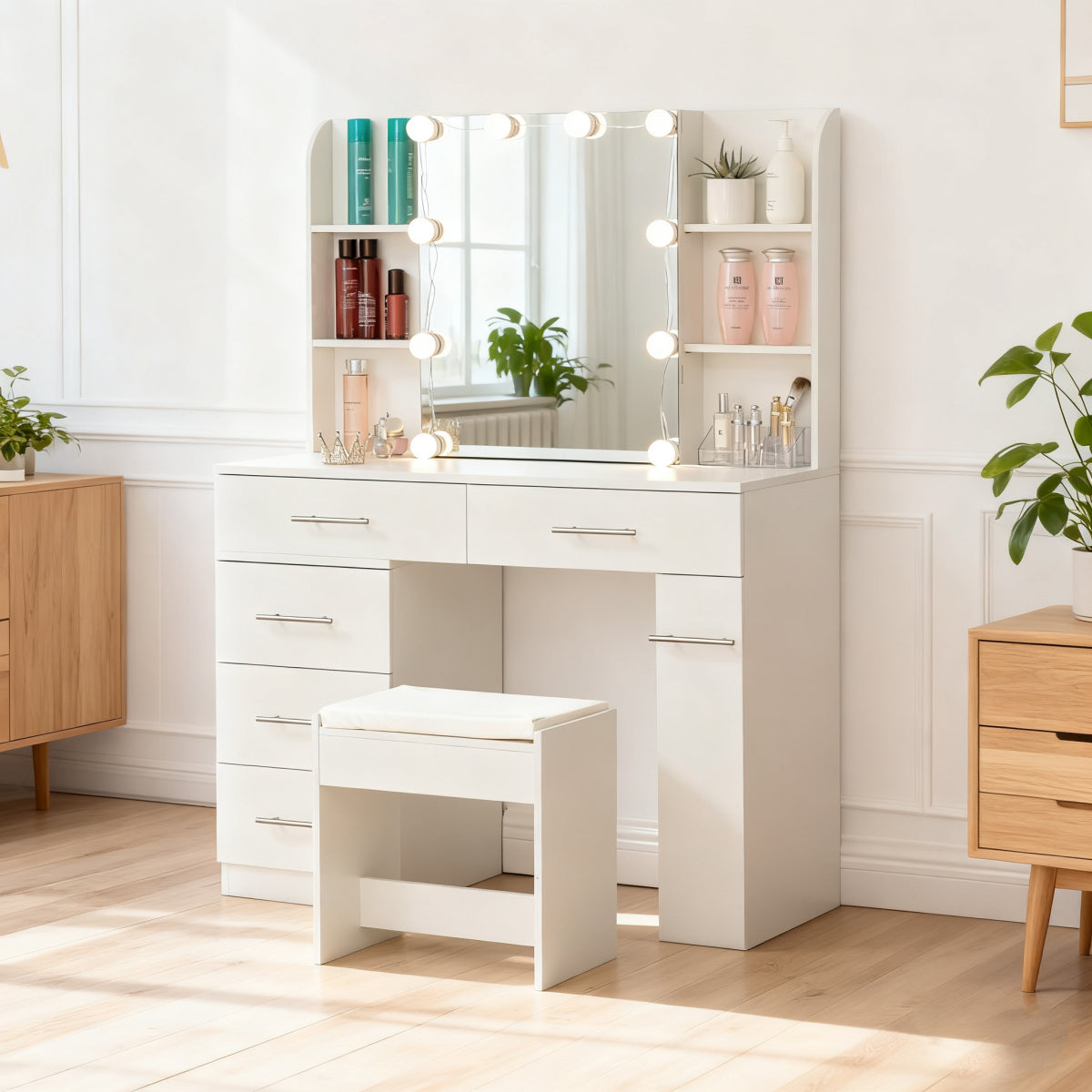 - Gepolsterter Hocker: Genießen Sie zusätzlichen Komfort, während Sie Make-up auftragen oder sich frisiert.