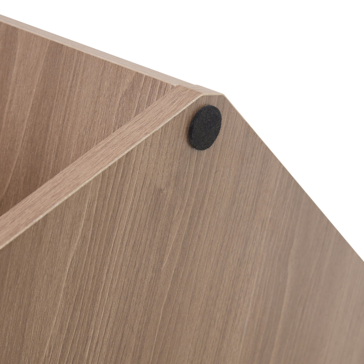 Gefertigt aus robusten MDF-Platten, besticht der Tisch durch seine tiefe Walnussholzmaserung. Die natürliche, klare Holzoptik in einem tiefen Pfirsichton schafft eine unverwechselbare organische Ästhetik und eine glatte, taktile Oberfläche. Die zylindrischen Tischbeine unterstreichen den klassischen, modernen Stil.