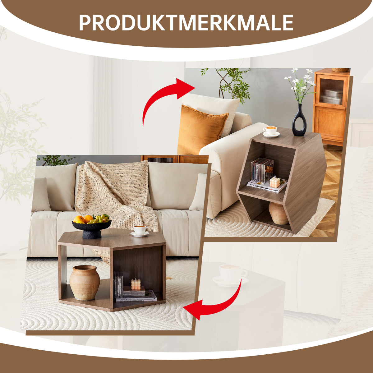 Mit seiner sechseckigen Form bietet der Tisch nicht nur eine große Ablagefläche, sondern auch erweiterte Wohnlösungen für vielseitige Räume und eine einfache Integration in bestehende Möbelkonzepte.