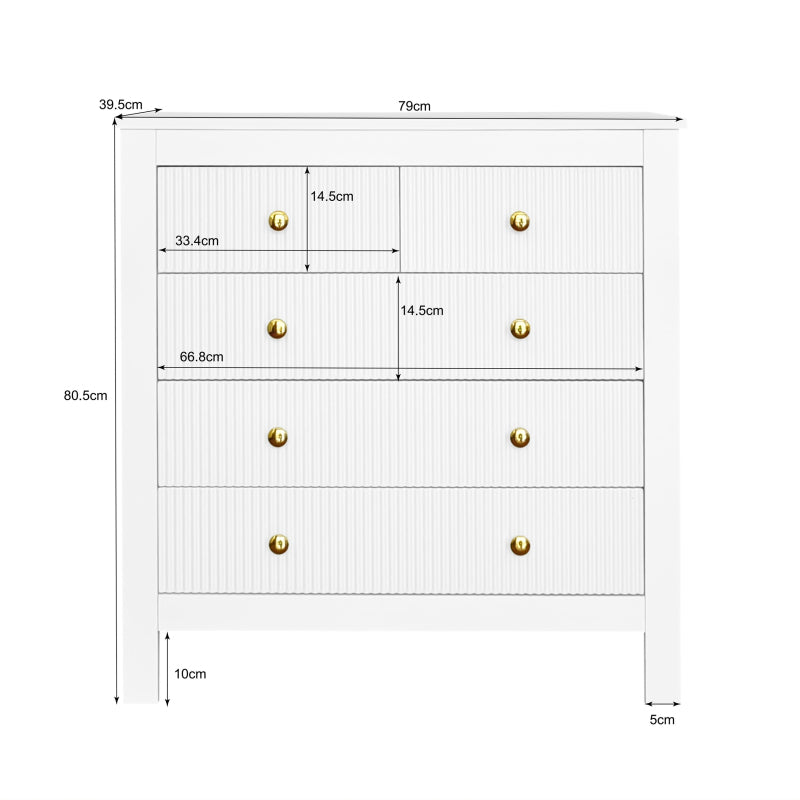 Diese Kommode mit 5 Schubladen vereint Eleganz und Funktionalität und ist somit die perfekte Ergänzung für jeden Raum. Die einzigartige strukturierte Oberfläche jeder Schublade sorgt für ein optisch ansprechendes Aussehen und ein einzigartiges haptisches Erlebnis und sorgt für einen Hauch von Raffinesse. Verdickte Beine sorgen für Stabilität und Haltbarkeit und machen es zu einem zuverlässigen Möbelstück für den Langzeitgebrauch. Jede Schublade verfügt über vergoldete Griffe für einen luxuriösen Glanz und ein edles Aussehen, das die strukturierte Oberfläche ergänzt. Mit fünf geräumigen Schubladen bietet diese Kommode Stauraum für Kleidung, Accessoires, anderes Geschirr usw. und hilft so, Ihren Wohnraum organisiert und aufgeräumt zu halten. Durch sein vielseitiges Design eignet es sich für verschiedene Räume wie Schlafzimmer, Wohnzimmer oder Flur. Diese Kommode fügt sich nahtlos in jeden Einrichtungsstil ein, wertet Ihre Inneneinrichtung auf und bietet gleichzeitig eine praktische Aufbewahrungslösung. Die Kombination aus solider Konstruktion, elegantem Design und praktischer Funktionalität macht diese Kommode zu einer wertvollen Ergänzung für Ihr Zuhause.