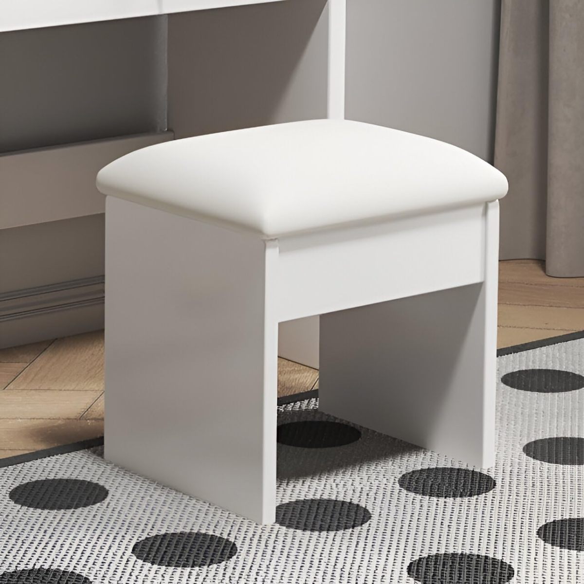 Dieses stilvolle, weiße Schminktisch-Set kombiniert ein elegantes Retro-Design mit höchster Funktionalität und schafft eine raffinierte und luxuriöse Atmosphäre in Ihrem Schlaf- oder Ankleidezimmer.