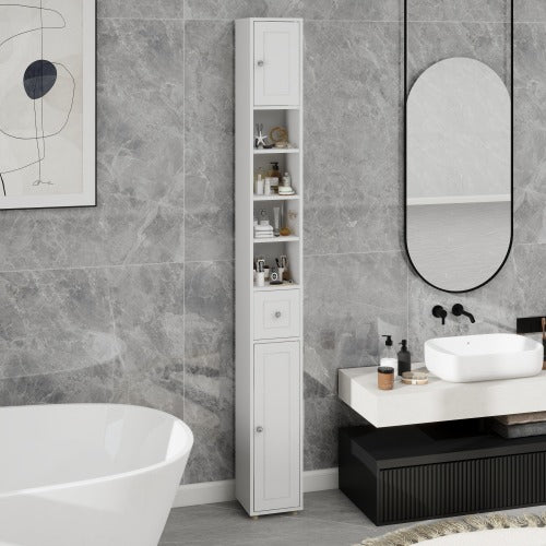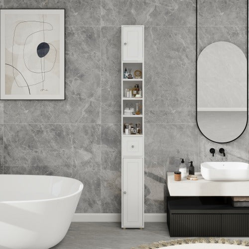 Reichlich Stauraum: Dieser freistehende Hochschrank ist mit 2 Lagerschränken, 4 Staufächern und 1 Schublade ausgestattet, um reichlich Stauraum für diverse Gegenstände wie Kosmetika, Schminkutensilien, Handtücher, Toilettenpapier, Dekorationen und mehr zu bieten.