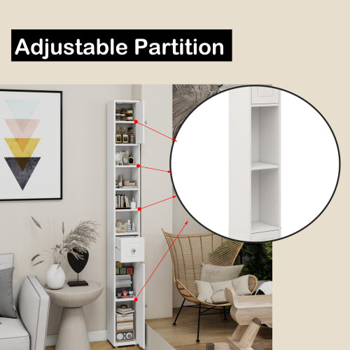 Gemacht für kleine Räume (Nischen): Dieser hohe, schmale Aufbewahrungsschrank ist auf Komfort und Funktionalität ausgelegt. Er ist perfekt für schmale Nischen oder zur Platzierung hinter einer Tür. Trotz der geringen Stellfläche bietet er viel Stauraum. Produktmaße: 7,87" x 7,87" x 70,87" (L x B x H) (ca. 20 x 20 x 180 cm).