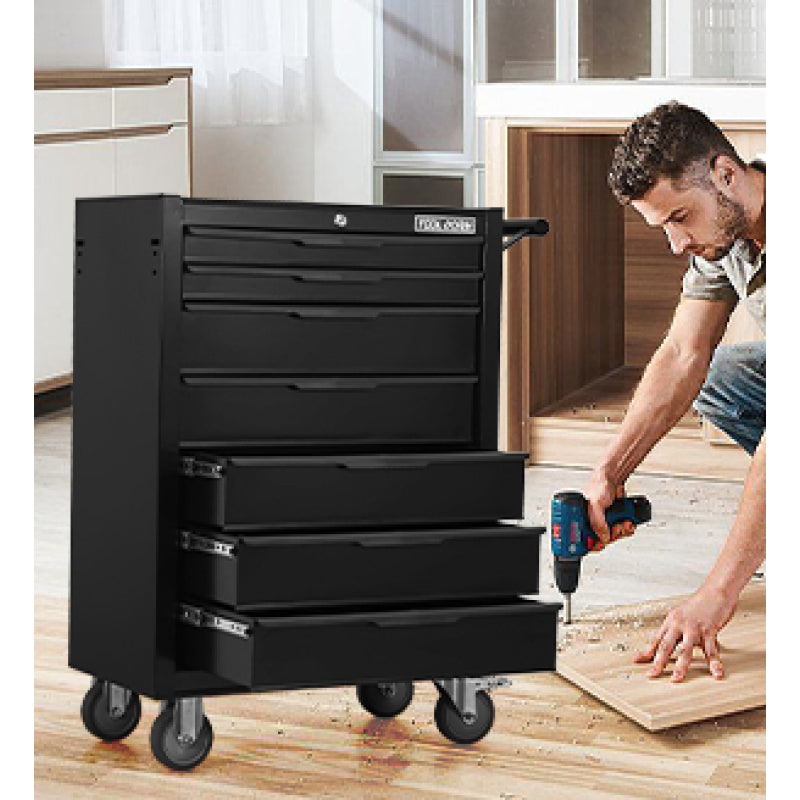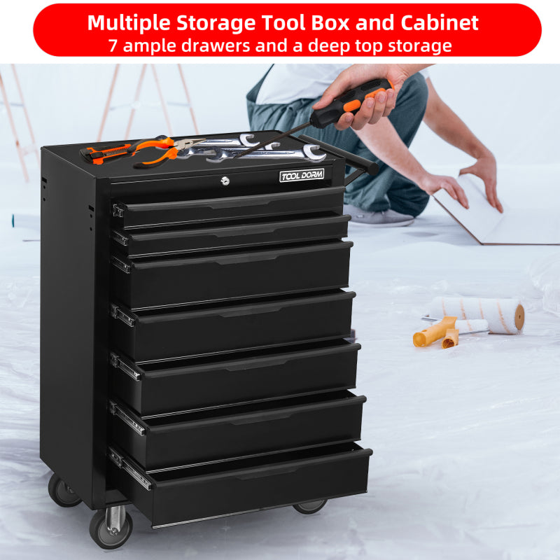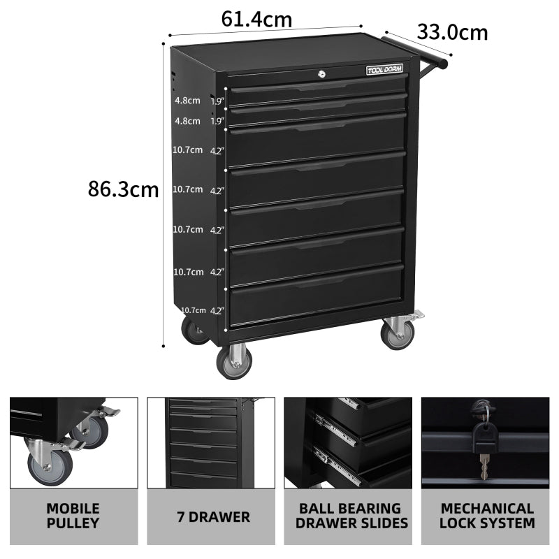 - Tool Cart Structure: Tool Cart Size is Length 24.2in*Depth 13in*whole Height 34.6in. The tool Cabinet is equipped with a total of 7 drawers. The top storage rack provides additional space for arranging workshop accessories you often need. Several Drawers on the bottom can be placed heavy and big tools.