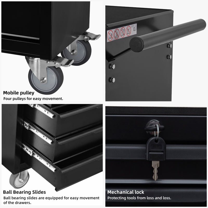 - Tool Cart Safety: Internal locking bar and tubular cam lock system keeps all drawers and lid secure with the convenience of one key. The drawer can not be opened when the key is locked. And the drawers will be not put down completely in right position then the key can not be closed to make sure drawers safety.