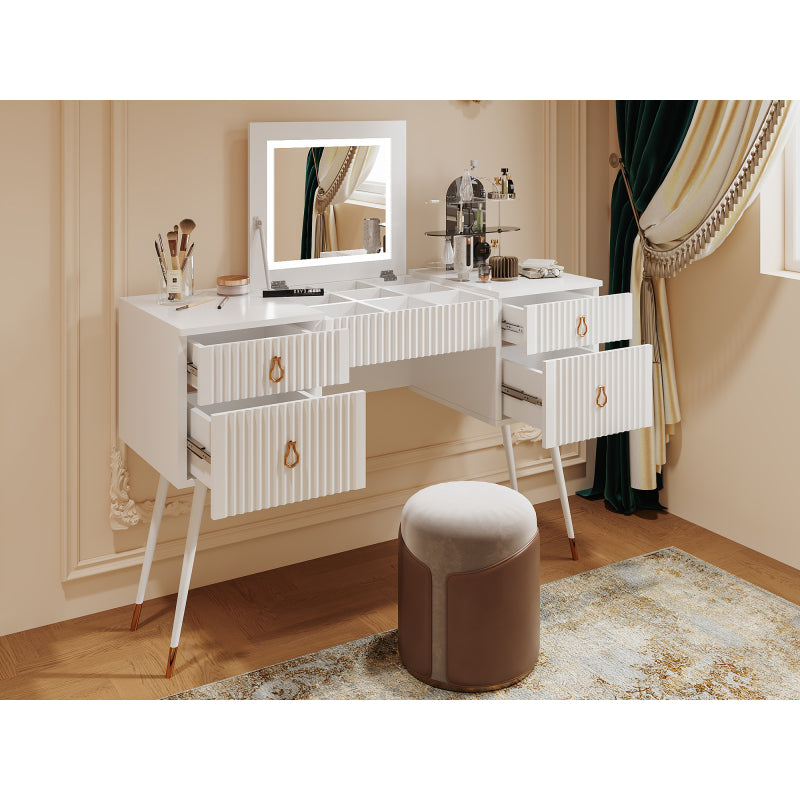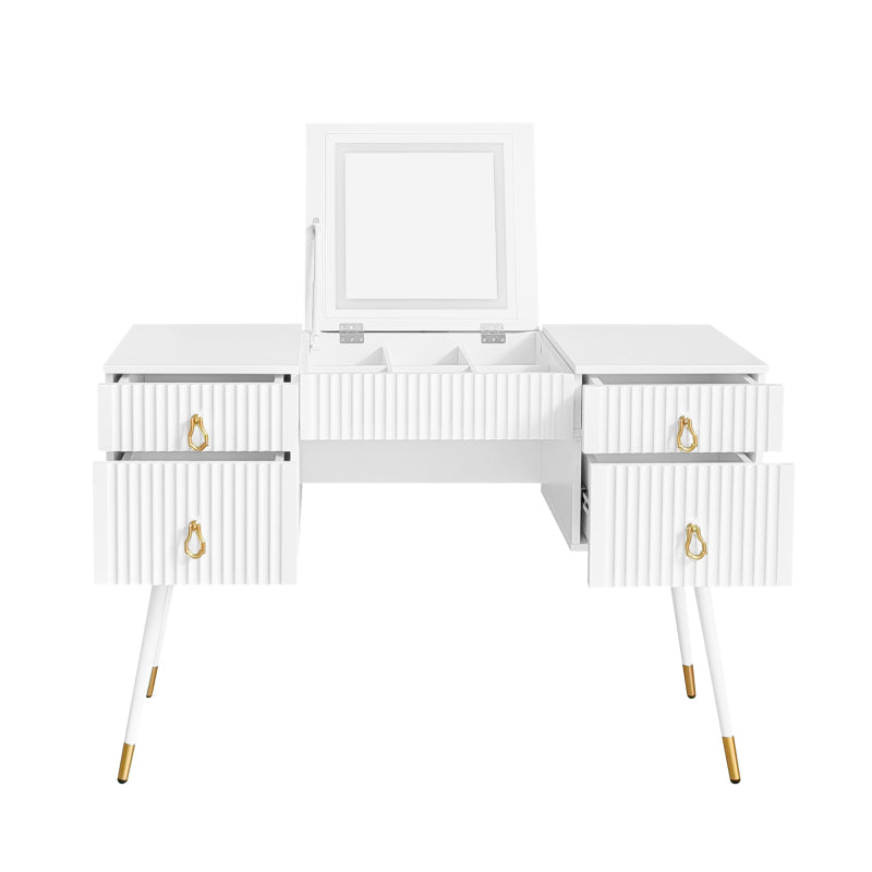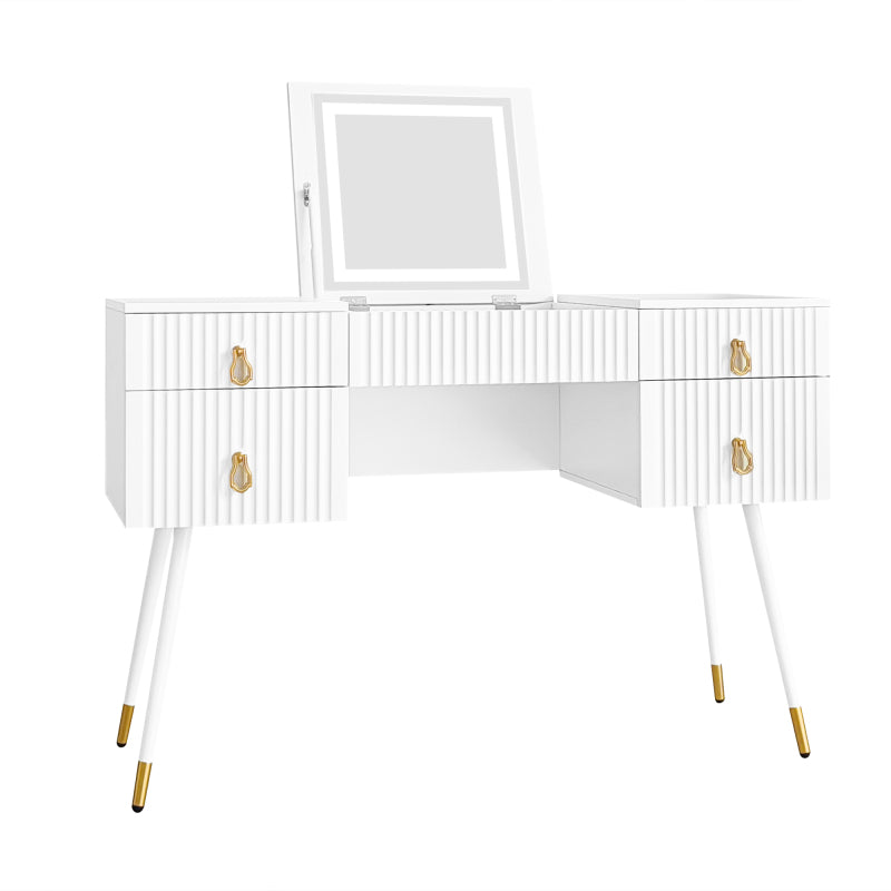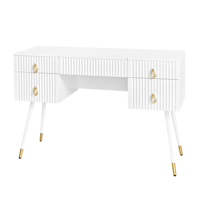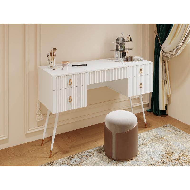 - Luxuriöse vergoldete Metallbeine: Das vergoldete Metallbeindesign erhöht nicht nur die Stabilität des Schminktisches, sondern verleiht dem Gesamtbild auch einen Hauch von modernem Luxus. Der Glanz der Metallbeine ergänzt die weiße Tischplatte und macht sie optisch wirkungsvoller.