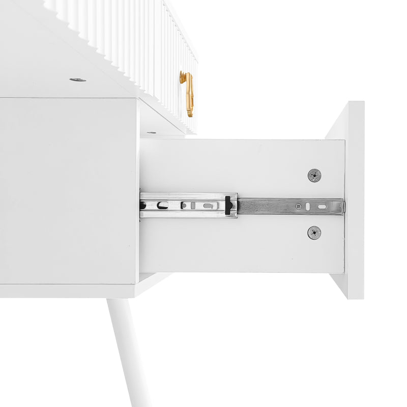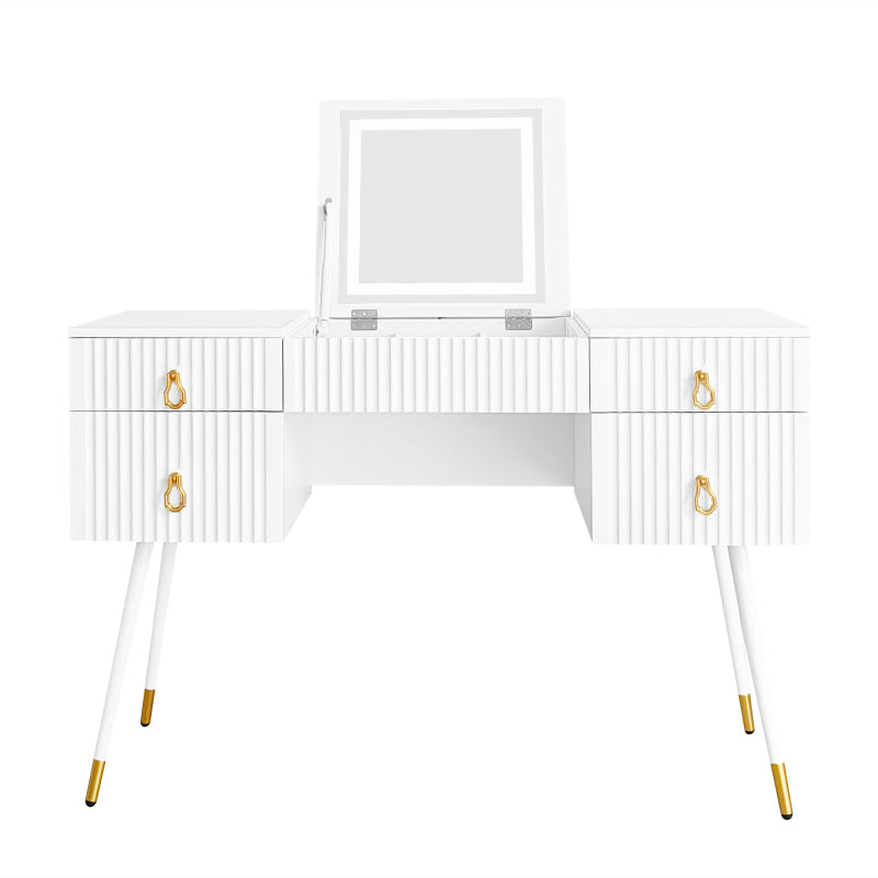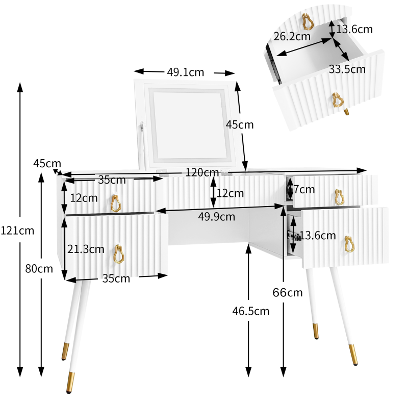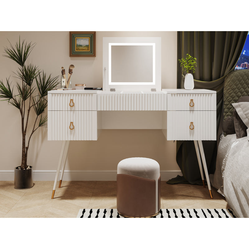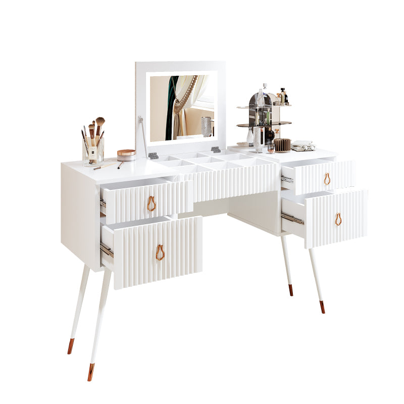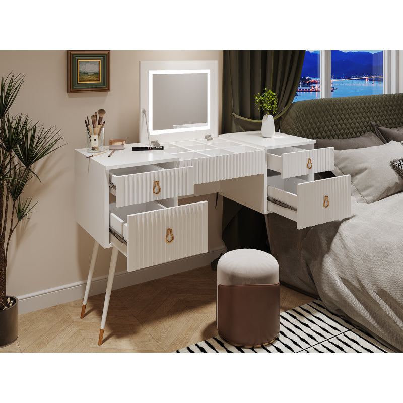- Luxuriöse vergoldete Metallbeine: Das vergoldete Metallbeindesign erhöht nicht nur die Stabilität des Schminktisches, sondern verleiht dem Gesamtbild auch einen Hauch von modernem Luxus. Der Glanz der Metallbeine ergänzt die weiße Tischplatte und macht sie optisch wirkungsvoller.
